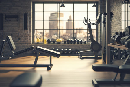 A well-equipped modern gym with various training equipment, including weights and a medicine ball, ready for a fitness regimen.. AI Generation