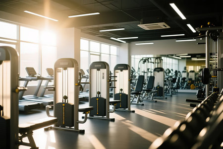A contemporary gym environment with advanced fitness equipment, softly blurred for a sleek and motivating workout background. The bright lighting and open space enhance the energetic ambiance.A lot of sport Exercise machine Stand behind one another. Blurred sunny sport club gym equipment.created with the help of artificial intelligence.