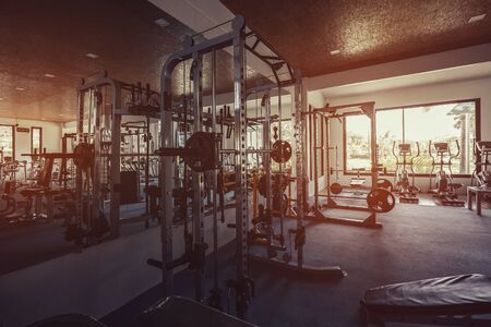 Interior of a fitness gym room with sports equipment. Toned image