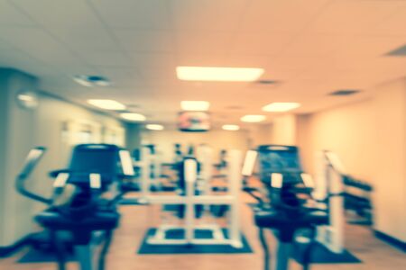 Abstract blur and defocused fitness equipment in gym interior for exercise