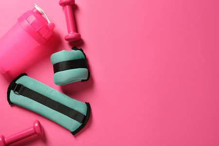 Turquoise weighting agents, dumbbells and shaker on pink background, flat lay. Space for text
