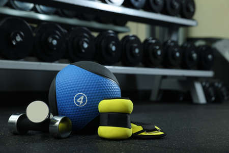Blue medicine ball, weighting agents and dumbbells on floor in gym, space for text