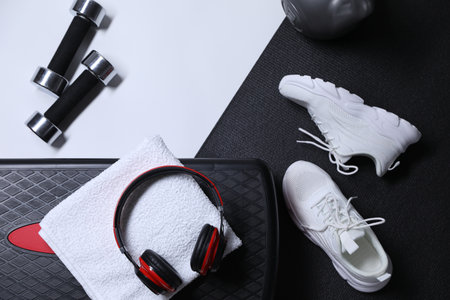 Sports equipment for fitness and gymnastics on white background. Flat lay and top view