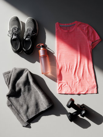 Arranged gym essentials include a vibrant shirt, water bottle, towel, dumbbells, and running shoes on a flat surface with soft shadows present.