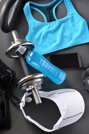 Sport bra, fitness gloves, digital stopwatch, dumbbells, water bottle, smartphone layout. Female sports training workout concept