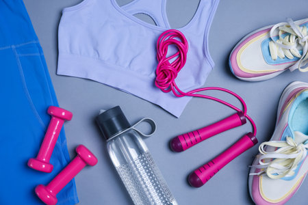 Sportswear, sneakers, skipping rope, dumbbells and water bottle on grey background, flat lay