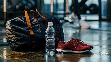 A pair of shoes and a gym bag lie on the floor, perfectly placed next to each other, ready to be picked up for a workout session.