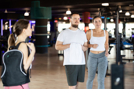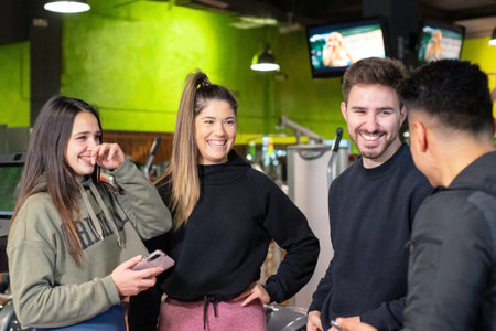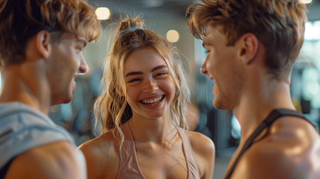 Group of Caucasian exercisers laughing cheerfully inside the gym.