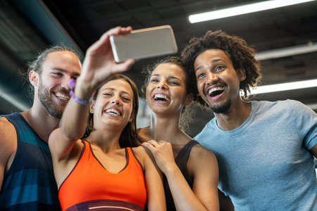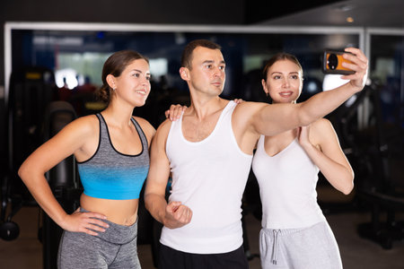 Beautiful sports team are holding sports equipment, looking at camera and smiling while doing selfie in fitness hall. AI Generated