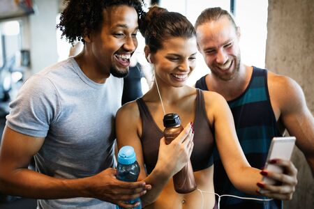 Happy smiling man and women having fun talking in gym. Group of young people relaxing in gym after workout training with black background.