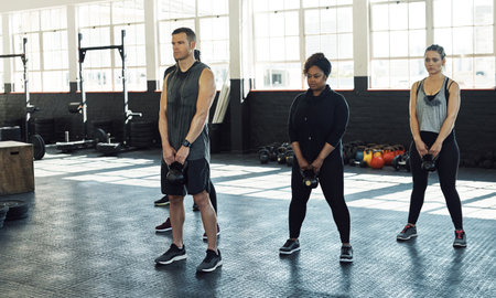 Whether you do it alone or join a fitness group, just do it. a fitness group using kettlebells while working out at the gym.