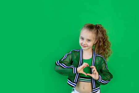 a cheerful girl with curly hair looks at the camera and shows a heart, standing on a green background. space for text.
