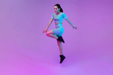 Young sportive woman training isolated on gradient studio background in neon light. athletic and graceful. Modern sport, action, motion, youth concept. Beautiful caucasian woman practicing
