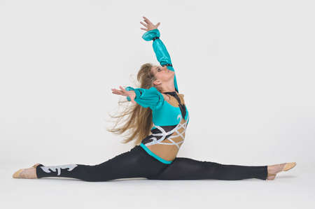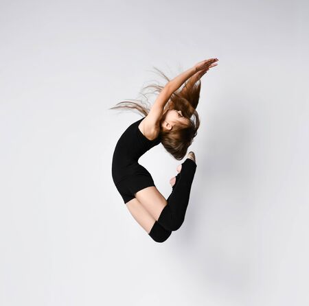 Sporty long haired girl gymnast in black sport body and uppers jumping and making dymnastic pose in air over white background. Rhythmic gymnastics beauty concept