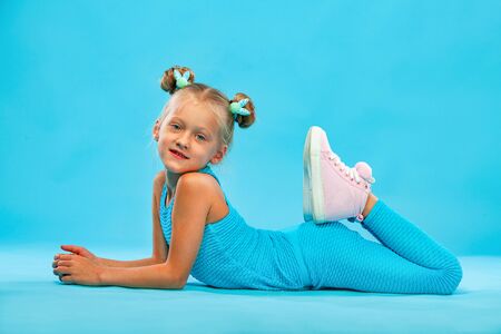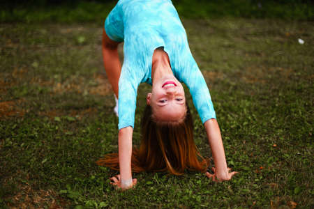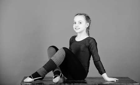 Acrobatics gym workout of girl. Gymnastics. Happy child sportsman. Fitness diet. Energy. success. Childhood activity. Sport and health. Having a little break. Free your mind. Dreaming about future