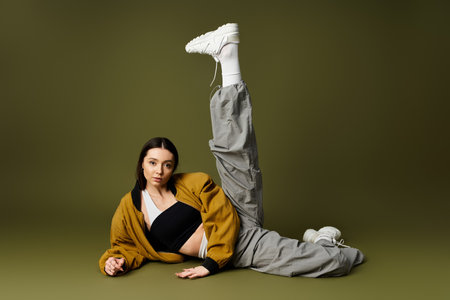 A young woman in stylish attire poses gracefully with one leg raised, radiating confidence.
