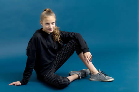 Trendy caucasian preteen girl model in fashion eyeglasses and tracksuit