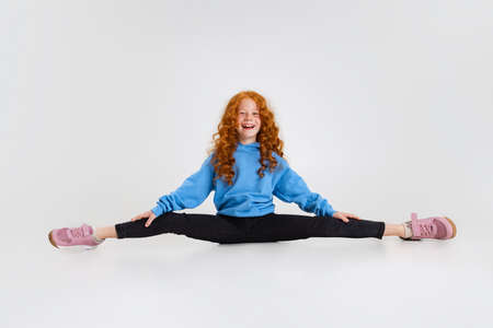 Commit. Get Fit. Flexible cute little girl child looking at camera while doing exercise isolated on a white background. Sport, training, fitness, active lifestyle concept. Horizontal shot. Web Banner