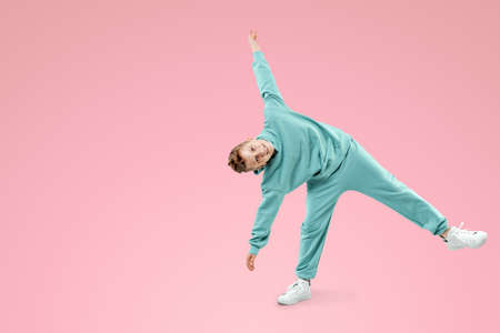 Kid girl doing fitness exercises on pink and pink background in sportswear. Sports concept.