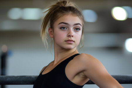 A young gymnast displays her concentration and grace while training in a gym. The soft lighting accentuates her determined expression as she prepares for her next move.