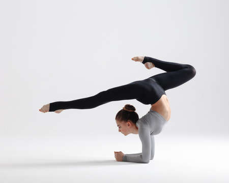 Indicative training circus school. Gymnastic workout. Girl with a flexible body