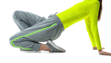 Sexy young girl performs sports exercises on a white background. Fitness, healthy lifestyle
