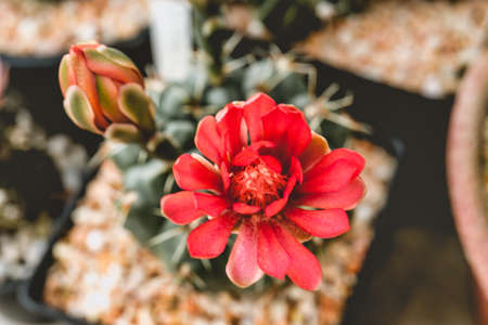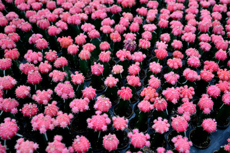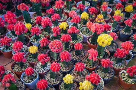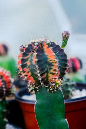 Red pink colorful cactus pot in the natural cactus farm nursery plant garden, little fresh cactus growing in a flower pot indoors, Gymnocalycium cactus