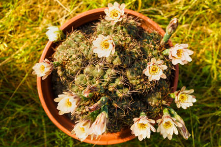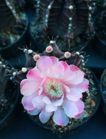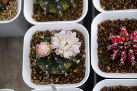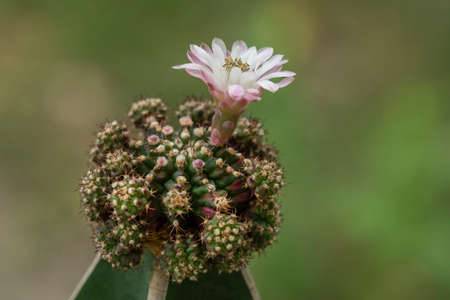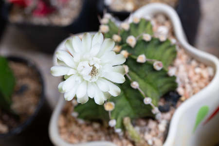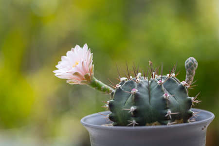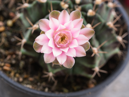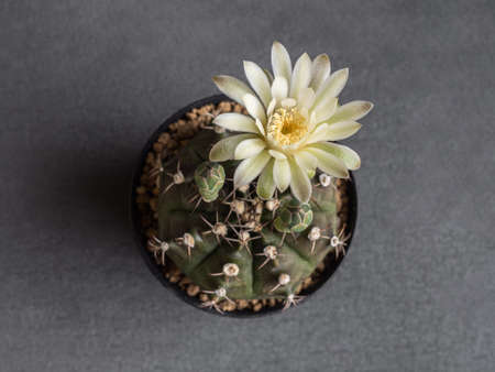 Close-up beautiful gymnocalycium cactus flower in flowerpot