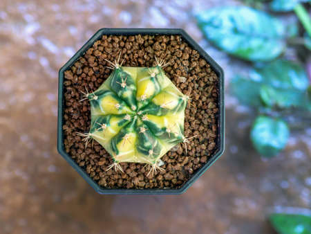 Gymnocalycium, Still life photography of succulent, Pot of gymnocalycium variegated, succulent pot plant for collection in glass house, selective focus and free space for text. Park and garden concept