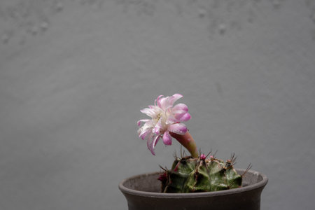 A Gymnocalycium cactus in a pot sprouts a delicate pink and white flower against a blurred grey background.