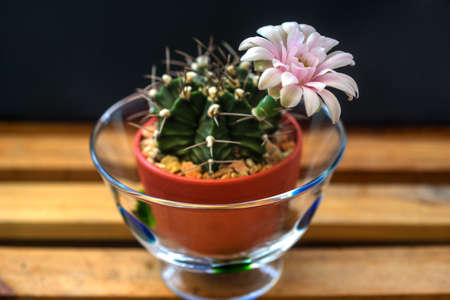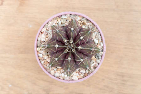 Gymnocalycium cactus on pot with wooden background
