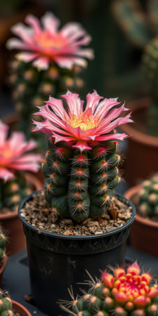 Beautiful cactus with pink flowers blooming in a greenhouse on a sunny afternoon