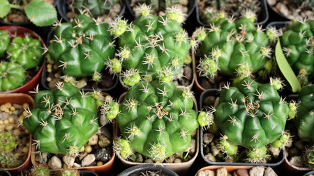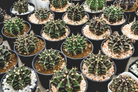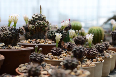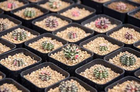 Cactus species (Gymnocalycium), planted in pots in greenhouses