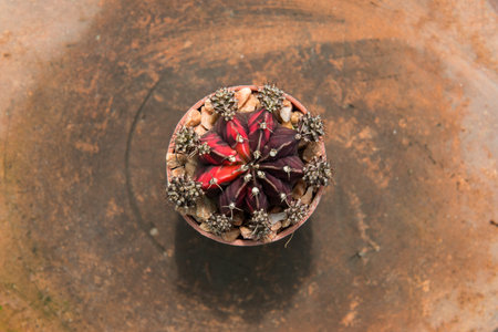 Red cactus in pot, top view.