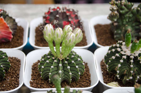 Gymnocalycium Friedrichii LB 2178, VoS Cactus close up on white pots in small cactus plant nursery.