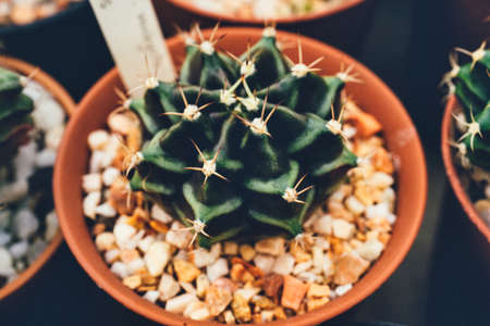 Beautiful green cactus plant in pot arranging in greenhouse.