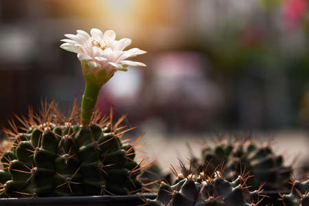 Close up white cactus flower blooming with warm sunlight background