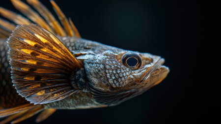 A vibrant fish with intricate patterns and fins, captured in a close-up shot against a dark background.