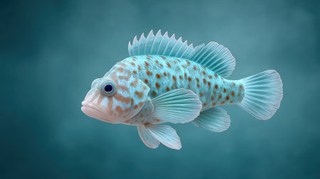 A blue fish with white spots is swimming in a blue ocean. The fish is small and has a curious look on its face
