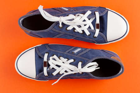 Blue warm winter or autumn sneakers with orange shoe laces on white concrete surface. Top view. Copy space. Flat lay
