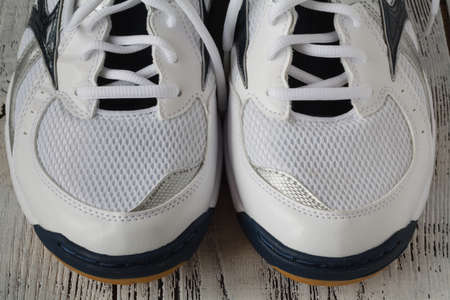 pair of white sport shoes on wooden background, Pair of white sneakers on a wooden background