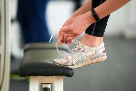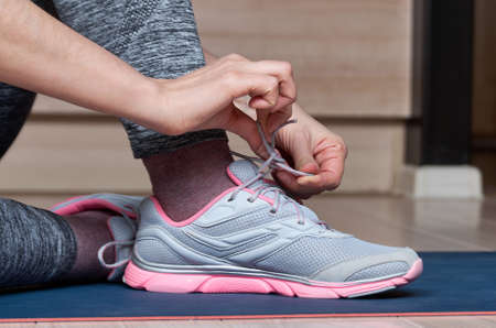 Close up woman tying sport shoes. Female hands tying shoelaces at gym, side view. Ready for training.