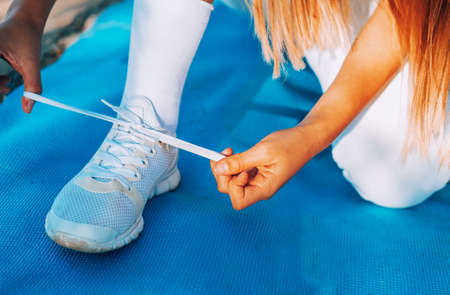 Crop photo fit woman tying the laces of a sneaker close-up and getting ready for a workout