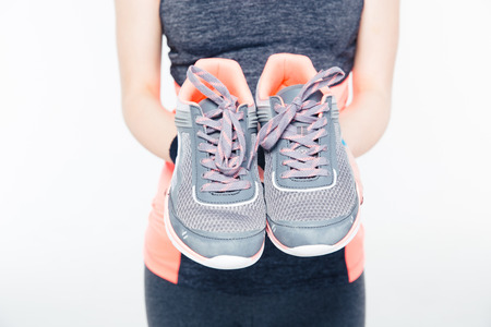 Closeup image of a woman`s hands holding sneakers