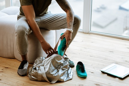 Putting sneakers. Close up of dark-skinned sportsman with tattoo putting sneakers into bag before going to gym