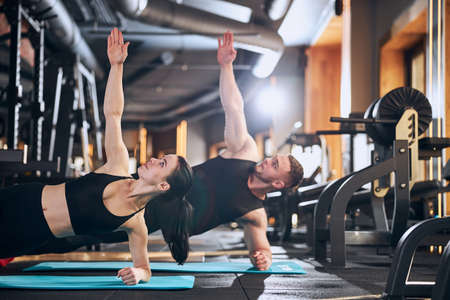 Happy sporty an and woman are exercising in gym and staying in side plank position