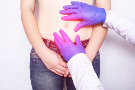 The doctor conducts a medical examination of the patient's girl whose abdominal pain, umbilical hernia of the abdomen, paraumbilical, discomfort