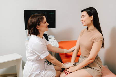 Gynecologist consulting patient before ultrasound examination. Gynecologist reassuring woman after gynecological exam. Post-exam consultation with gynecologist