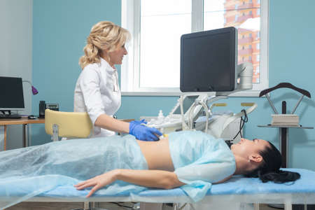 Female doctor operating ultrasound scanner examining belly of her female patient