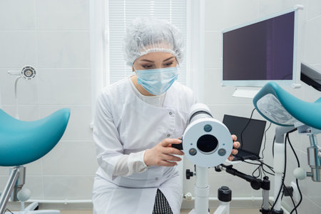 doctor wearing a cap and a mask prepares the colposcope for use.